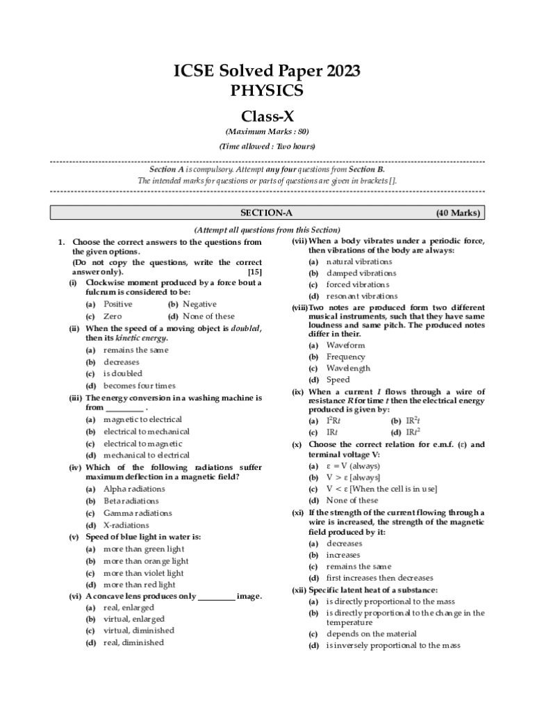 This document is a solved paper for ICSE Physics for Class 10, covering various topics and questions with explanations and answers. It includes multiple-choice questions, descriptive questions, and practical applications relevant to the syllabus.