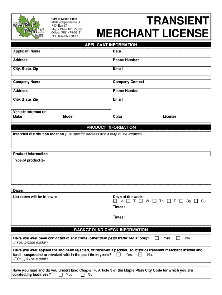 This document is an application for obtaining a transient merchant license in the City of Maple Plain. It includes sections for applicant information, vehicle information, product information, background