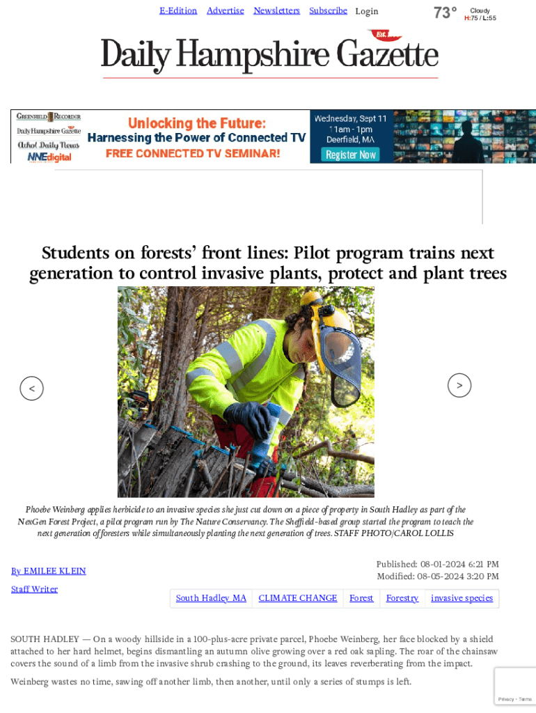 EEditionAdvertiseNewslettersSubscribe73LoginCloudy H:75 / L:55FUN! F O S Y A D 4 BEST LITTLE FAIR in the country It\'s time for theStudents on forests front lines: Pilot program trains next generation to control invasive plants, protect and plant treesPhoebe Weinberg applies herbicide to an invasive species she just cut down on a piece of property in South Hadley as part of the NexGen Forest Project, a pilot program run by The Nature Conservancy. The Sheffieldbased group