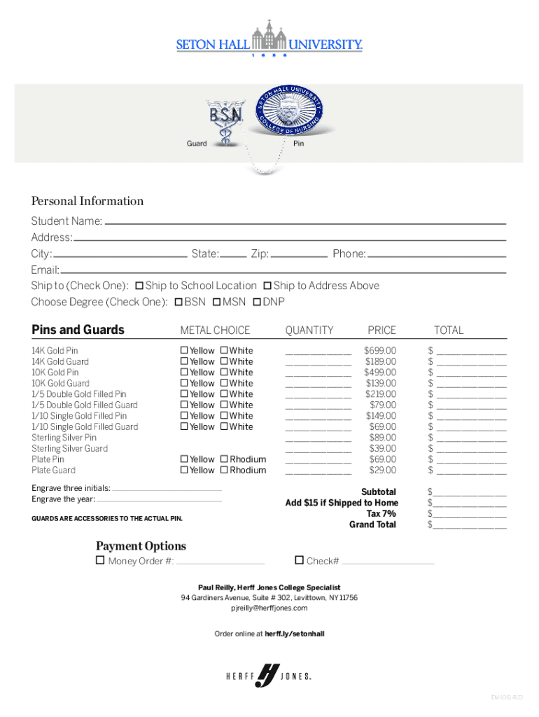 GuardPinPersonal Information Student Name:Address:City: State: Zip: Phone: Email:Ship to (Check One): Ship to School Location Ship to Address Above Choose Degree (Check One): BSN MSN DNPPins and GuardsMETAL CHOICE14K Gold PinYellow 14K Gold GuardYellow 10K Gold PinYellow 10K Gold GuardYellow 1/5 Double Gold Filled PinYellow 1/5 Double Gold Filled GuardYellow 1/10 Single Gold Filled PinYellow 1/10 Single Gold Filled GuardYellow Sterling