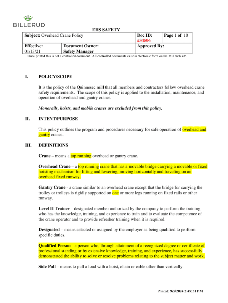 EHS SAFETY Subject: Overhead Crane Policy Effective: 01/13/21Document Owner: Safety ManagerDoc ID: Page 1 of 10 #34506 Approved By:Once printed this is not a controlled document. All controlled documents exist in electronic form on the Mill web site.I.POLICY/SCOPE It is the policy of the Quinnesec mill that all members and contractors follow overhead crane safety requirements. The scope of this policy is applied to the installation, maintenance, and operation of overhead and gantry cranes