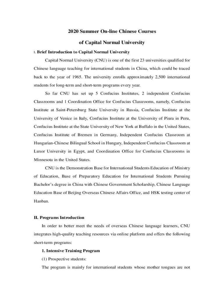 2020 Summer Online Chinese Courses of Capital Normal University I. Brief Introduction to Capital Normal UniversityCapital Normal University (CNU) is one of the first 23 universities qualified for