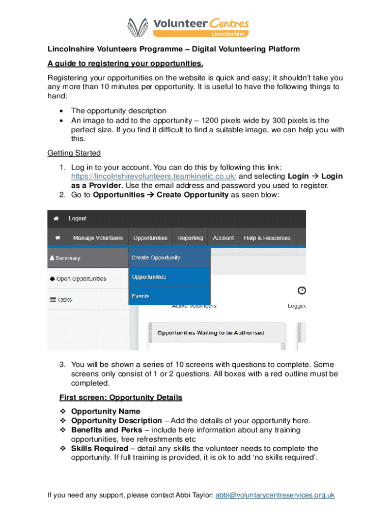 A guide to registering your opportunities on the Lincolnshire Volunteers website, detailing the steps and requirements for creating opportunities for volunteers.