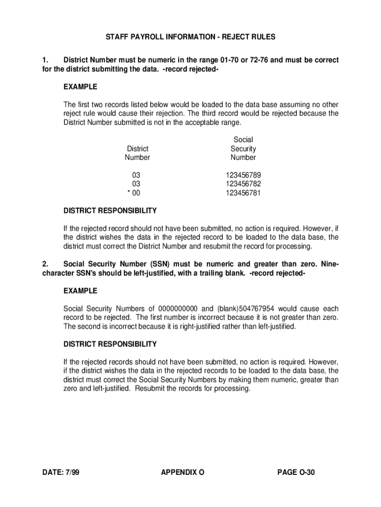 Este documento detalla las reglas de rechazo para la información de nómina del personal, incluyendo los códigos de estado de empleo, requisitos para los números de seguridad social, y las condiciones