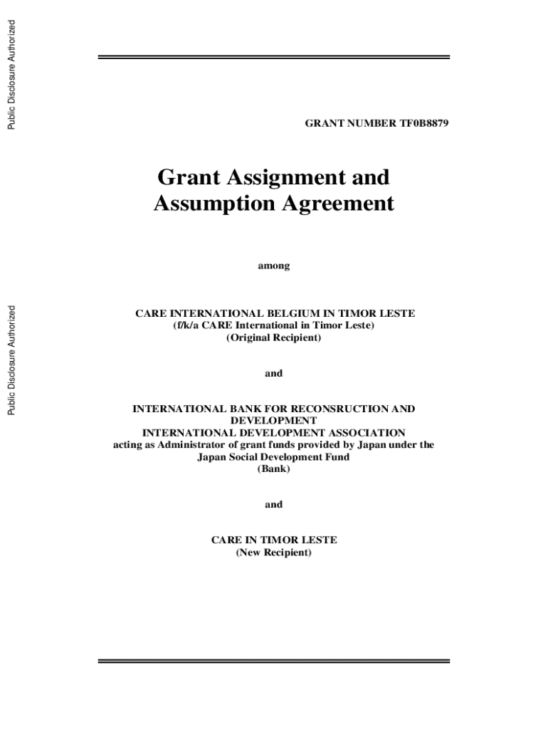 This document outlines the agreement between CARE International Belgium in Timor Leste (the Original Recipient) and CARE in Timor Leste (the New Recipient) for the assignment and assumption of a grant provided by the International Bank for Reconstruction and Development under the Japan Social Development Fund.