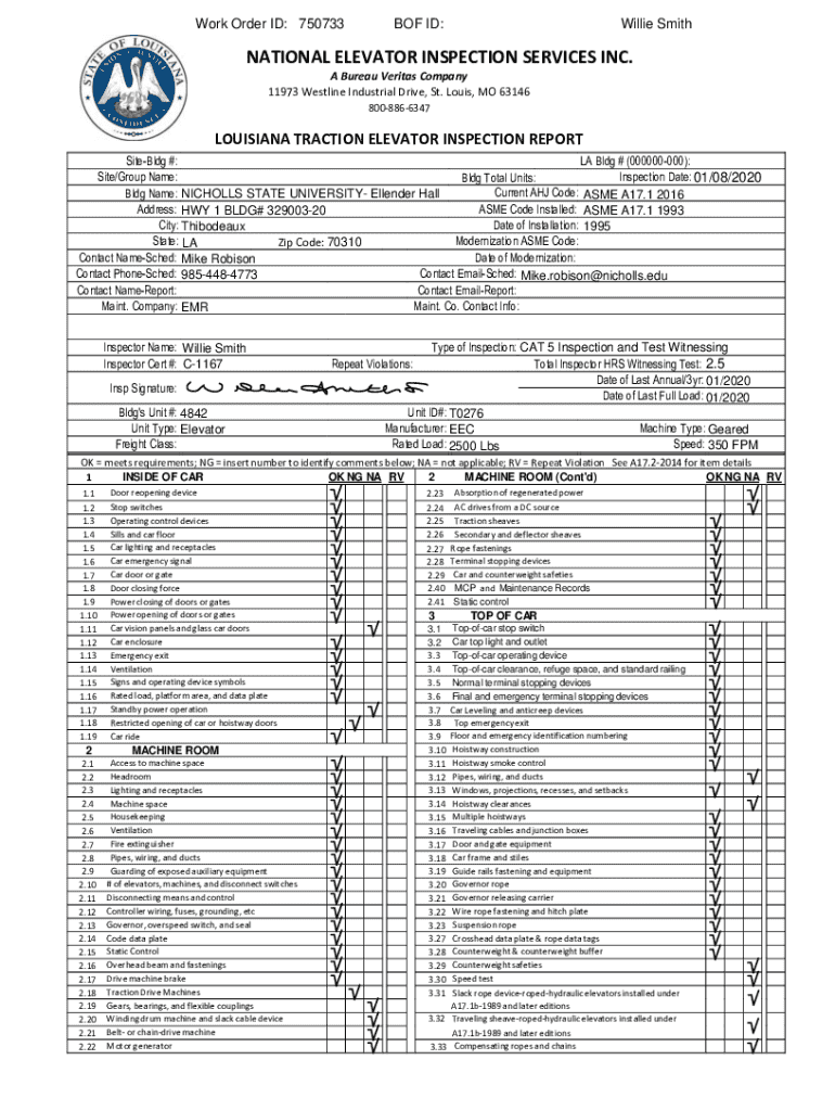 Work Order ID: 750733BOF ID:Willie SmithNATIONAL ELEVATOR INSPECTION SERVICES INC. A Bureau Veritas Company 11973 Westline Industrial Drive, St. Louis, MO 63146 8008866347LOUISIANA TRACTION ELEVATOR