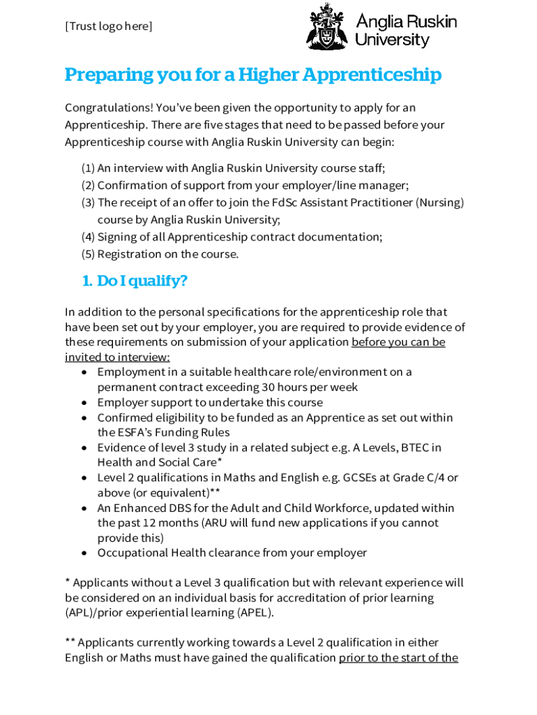 [Trust logo here]Preparing you for a Higher Apprenticeship Congratulations! Youve been given the opportunity to apply for an Apprenticeship. There are five stages that need to be passed before your Apprenticeship course with Anglia Ruskin University can begin: (1) An interview with Anglia Ruskin University course staff; (2) Confirmation of support from your employer/line manager; (3) The receipt of an offer to join the FdSc Assistant Practitioner (Nursing) course by Anglia Ruskin University; (4)