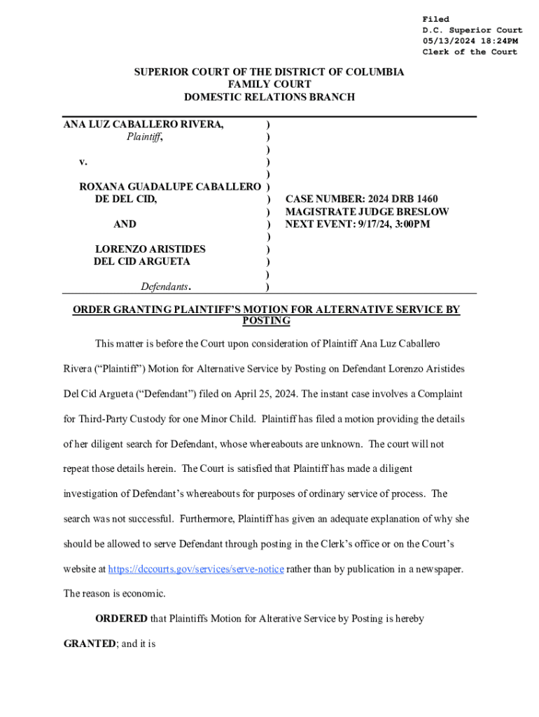 Filed D.C. Superior Court 05/13/2024 18:24PM Clerk of the CourtSUPERIOR COURT OF THE DISTRICT OF COLUMBIA FAMILY COURT DOMESTIC RELATIONS BRANCH ANA LUZ CABALLERO RIVERA, Plaintiff,) ) ) v. ) ) ROXANA GUADALUPE CABALLERO ) DE DEL CID, ) ) AND ) ) LORENZO ARISTIDES ) DEL CID ARGUETA ) ) Defendants. )CASE NUMBER: 2024 DRB 1460 MAGISTRATE JUDGE BRESLOW NEXT EVENT: 9/17/24, 3:00PMORDER GRANTING PLAINTIFFS MOTION FOR ALTERNATIVE SERVICE BY POSTING This matter is before the Court upon consideration
