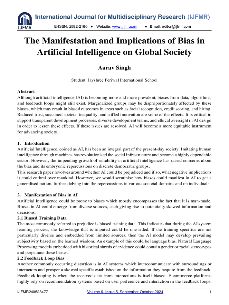 This research paper explores the biases inherent in artificial intelligence systems, detailing their sources such as biased training data, feedback loops, and algorithmic bias, and discusses the negative
