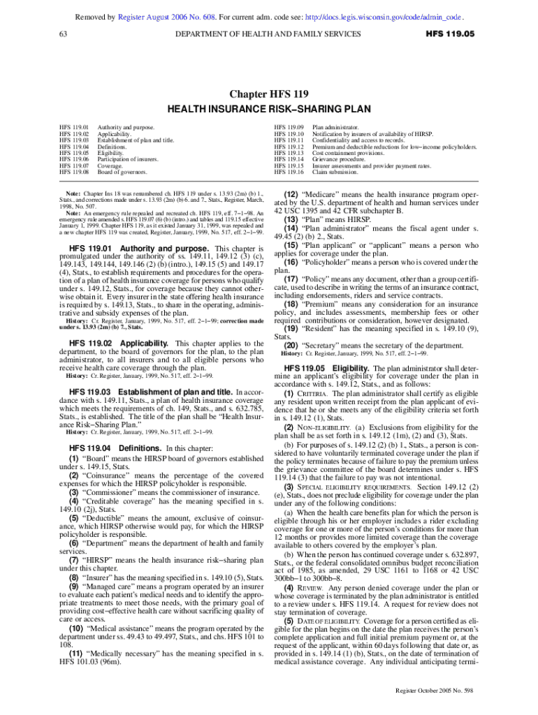 Removed by Register August 2006 No. 608. For current adm. code see: http://docs.legis.wisconsin.gov/code/admin_code . 63DEPARTMENT OF HEALTH AND FAMILY SERVICESHFS 119.05Chapter HFS 119 HEALTH INSURANCE RISKSHARING PLAN HFS 119.01 HFS 119.02 HFS 119.03 HFS 119.04 HFS 119.05 HFS 119.06 HFS 119.07 HFS 119.08Authority and purpose. Applicability. Establishment of plan and title. Definitions. Eligibility. Participation of insurers. Coverage. Board of governors.Note: Chapter Ins 18 was renumbered ch