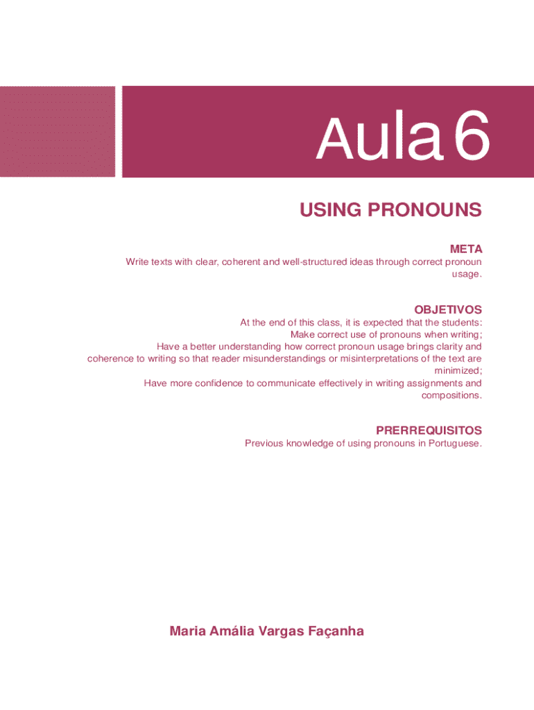 Aula 6 USING PRONOUNS META Write texts with clear, coherent and wellstructured ideas through correct pronoun usage.OBJETIVOS At the end of this class, it is expected that the students: Make correct