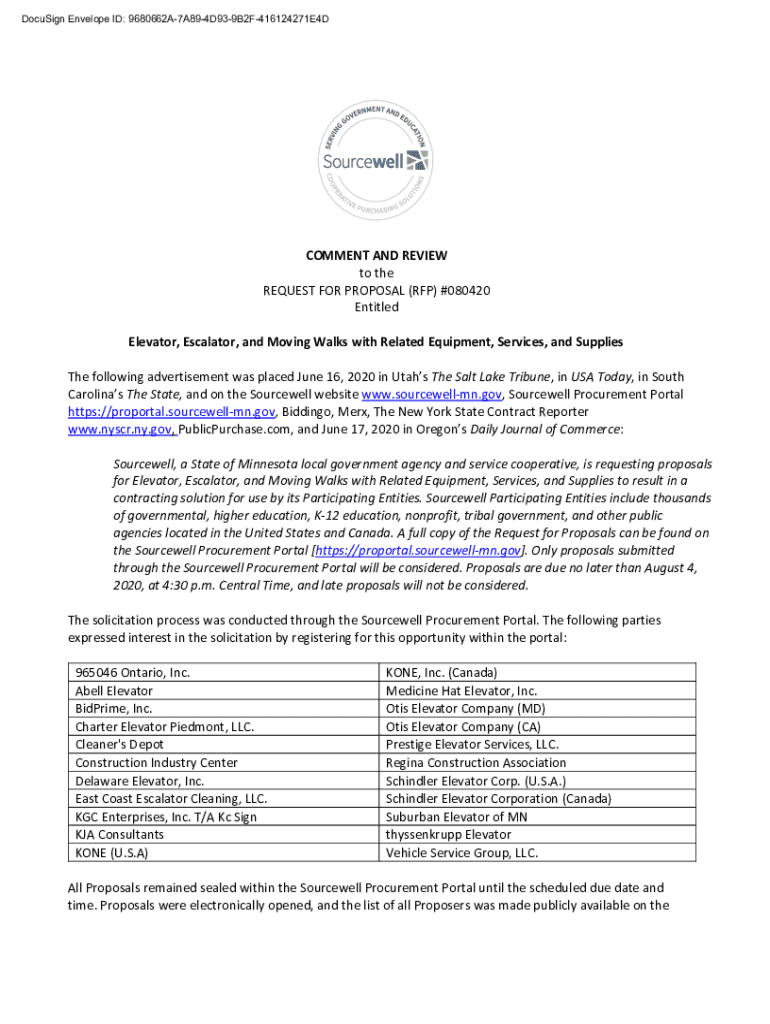 DocuSign Envelope ID: 9680662A7A894D939B2F416124271E4DCOMMENT AND REVIEW to the REQUEST FOR PROPOSAL (RFP) #080420 Entitled Elevator, Escalator, and Moving Walks with Related Equipment, Services, and Supplies The following advertisement was placed June 16, 2020 in Utahs The Salt Lake Tribune, in USA Today, in South Carolinas The State, and on the Sourcewell website www.sourcewellmn.gov, Sourcewell Procurement Portal https://proportal.sourcewellmn.gov, Biddingo, Merx, The New York State...