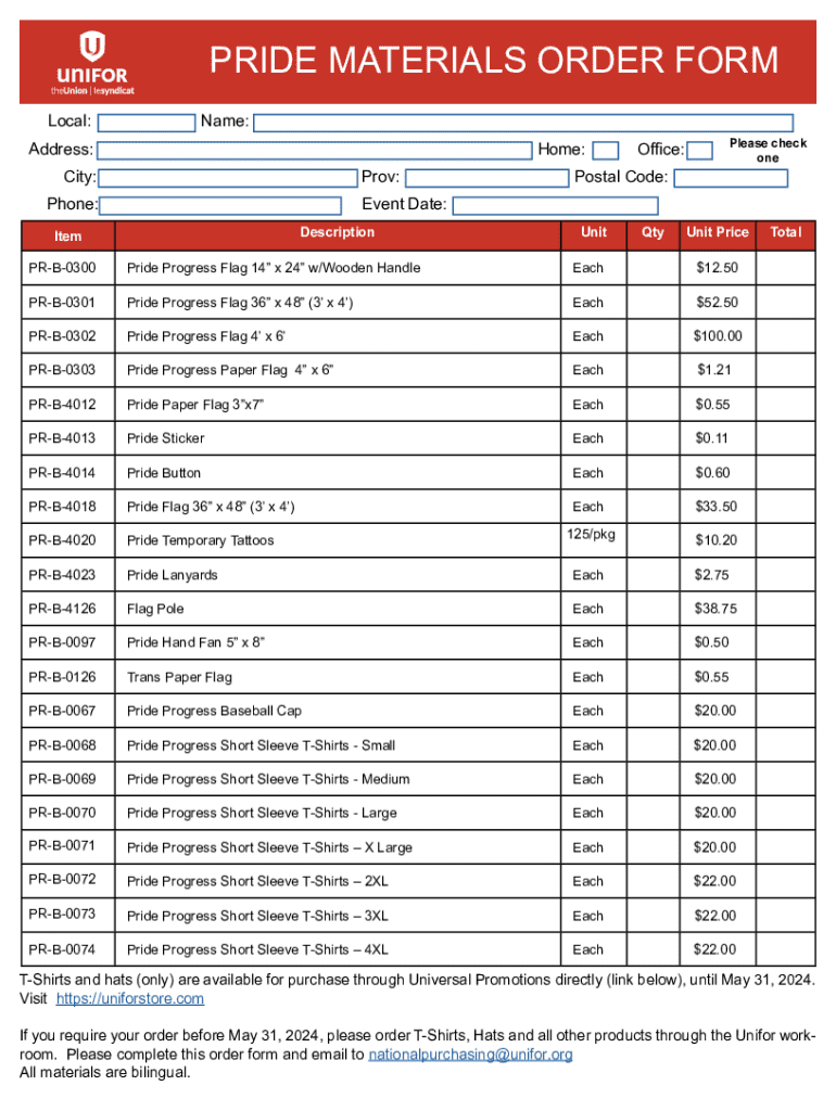 This form is used to order various Pride materials including flags, stickers, buttons, and t-shirts. Customers can specify the quantity and unit price of the items they wish to purchase. T-Shirts and hats can be bought through Universal Promotions until May 31, 2024. Orders can be sent via email to nationalpurchasing@unifor.org.