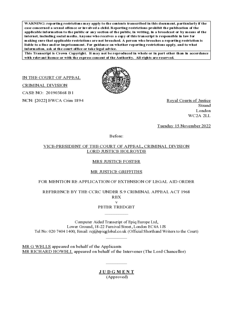WARNING: reporting restrictions may apply to the contents transcribed in this document, particularly if the case concerned a sexual offence or involved a child. Reporting restrictions prohibit the publication of the applicable information to the public or any section of the public, in writing, in a broadcast or by means of the internet, including social media. Anyone who receives a copy of this transcript is responsible in law for making sure that applicable restrictions are not breached. A...
