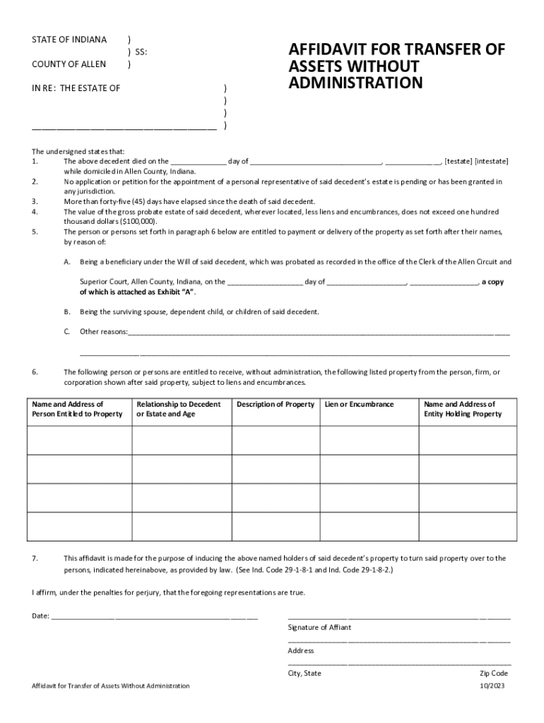 STATE OF INDIANA COUNTY OF ALLEN) ) SS: )AFFIDAVIT FOR TRANSFER OF ASSETS WITHOUT ADMINISTRATIONIN RE: THE ESTATE OF) ) ) ___ )The undersigned states that: 1. The above decedent died on the ___ day of ___, ___, [testate] [intestate] while domiciled in Allen County, Indiana. 2. No application or petition for the appointment of a personal representative of said decedents estate is pending or has been granted in any jurisdiction. 3. More than fortyfive (45) days have elapsed since the death of...