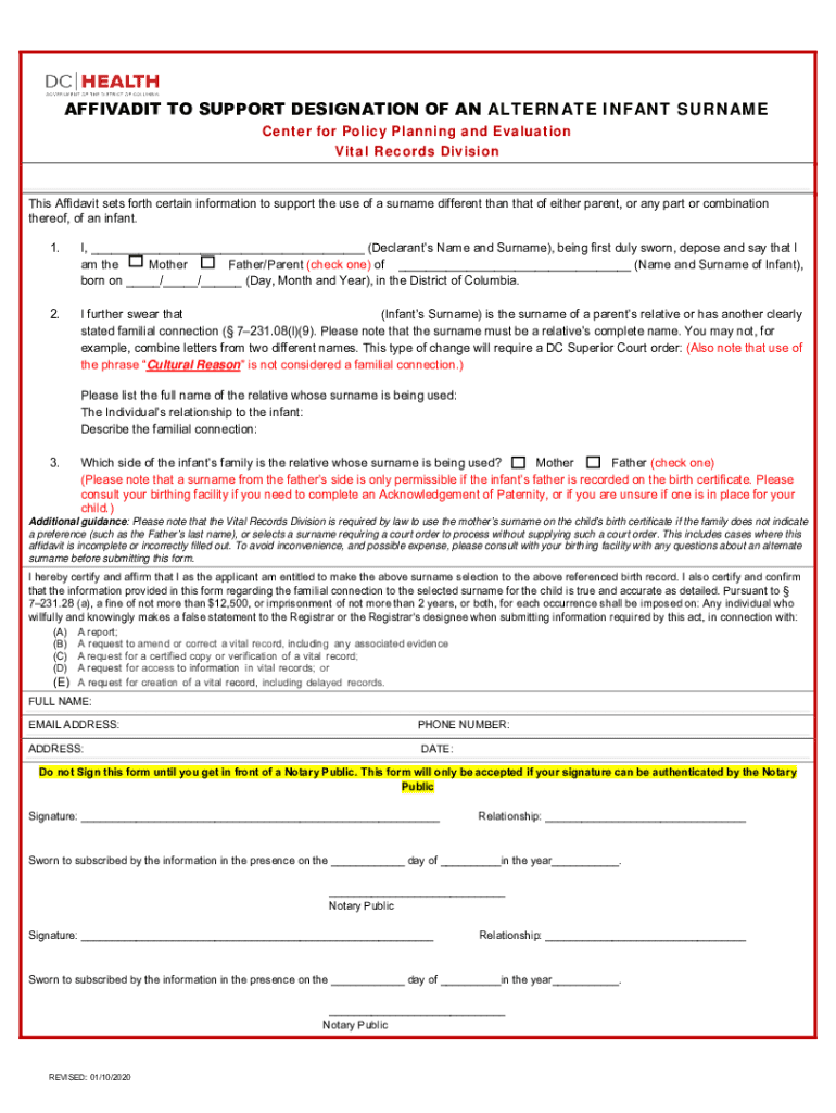 Get the free Affidavit to Support Designation of an Alternate Infant Surname - dchealth dc