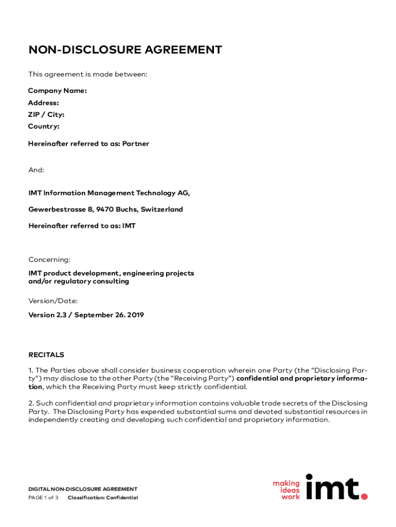 This agreement is designed to protect confidential information exchanged between IMT Information Management Technology AG and a Partner regarding product development, engineering projects, and/or
