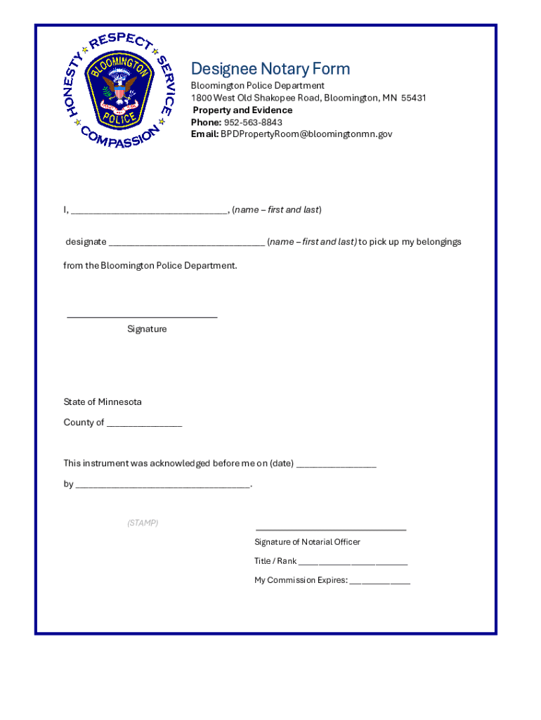 This form is used to designate an individual to retrieve personal belongings from the Bloomington Police Department, requiring notarization.