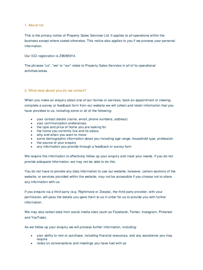 1. About Us This is the privacy notice of Property Sales Services Ltd. It applies to all operations within the business except where stated otherwise. This notice also applies to you if we process