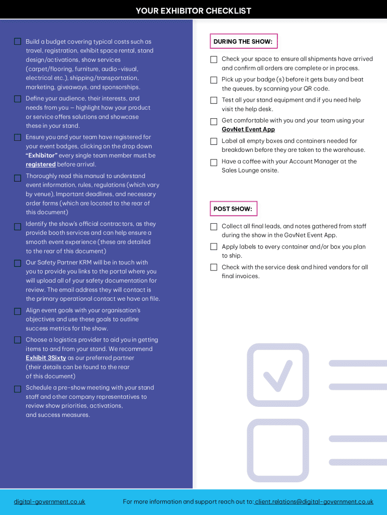 This manual provides essential information for exhibitors at The Digital Government Expo, including checklists, exhibitor responsibilities, and details regarding the exhibition stand and shell schemes. It aims to assist exhibitors in their planning and execution of the event.