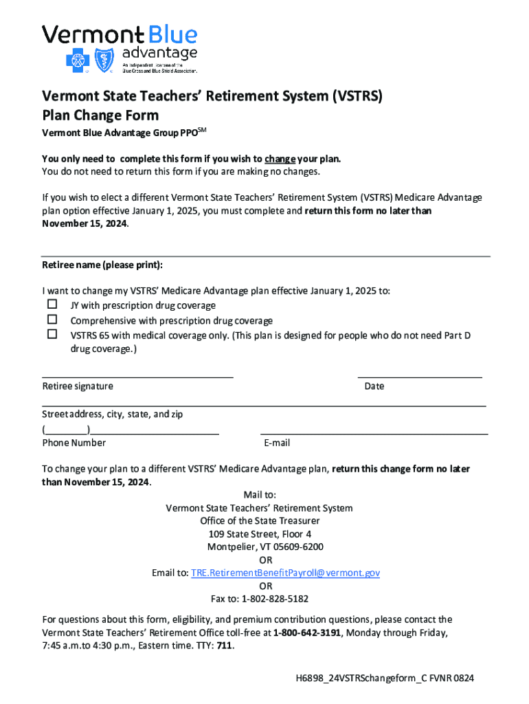 This form is to be completed by retirees who wish to change their Medicare Advantage plan option under the Vermont State Teachers’ Retirement System effective January 1, 2025. The form must be returned by November 15, 2024.