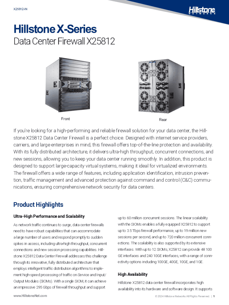 X25812INHillstone XSeries Data Center Firewall X25812FrontRearIf youre looking for a highperforming and reliable firewall solution for your data center, the Hillstone X25812 Data Center Firewall is a perfect choice. Designed with internet service providers, carriers, and large enterprises in mind, this firewall offers topoftheline protection and availability. With its fully distributed architecture, it delivers ultrahigh throughput, concurrent connections, and new sessions, allowing