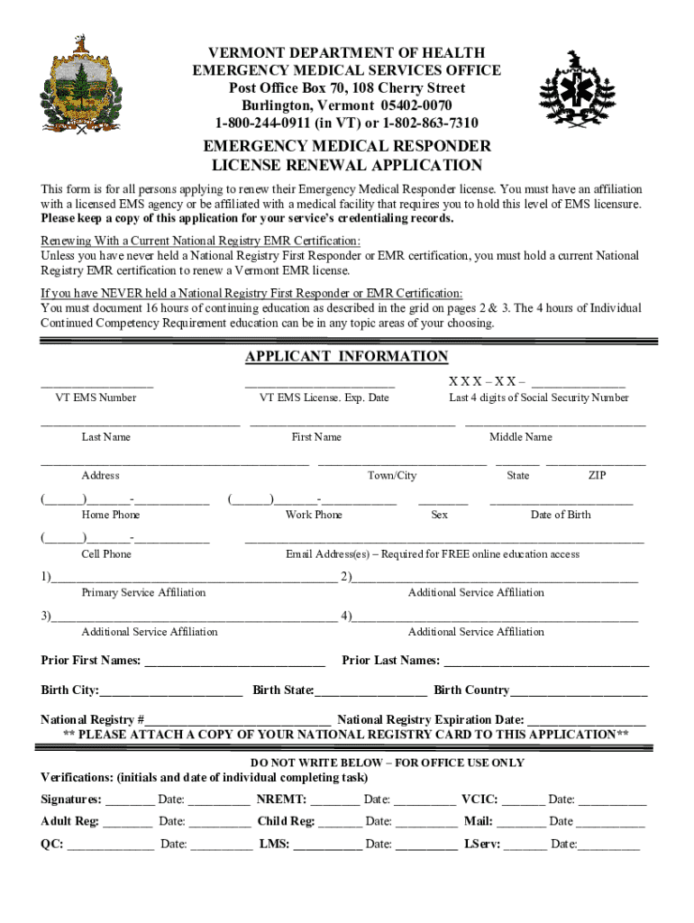 This form is for all persons applying to renew their Emergency Medical Responder license. It outlines the requirements and necessary documentation for the renewal process including affiliation with