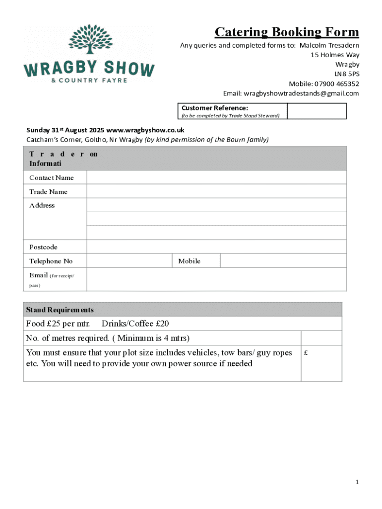 This form is used for booking a catering stand at the Wragby Show. It requires details about the trader, stand requirements, risk assessments, and compliance with local authority regulations for food hygiene and fire safety.