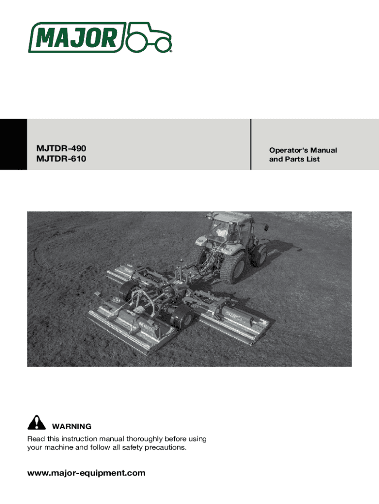 MJTDR490 MJTDR610WARNING Read this instruction manual thoroughly before using your machine and follow all safety precautions.www.majorequipment.comOperators Manual and Parts ListHead Office Major Equipment Intl. Ltd. Ballyhaunis, Co. Mayo, Ireland. Tel.:Fax:Email:+353 (0) 9496 30572 +353 (0) 9496 30788 info@majorequipment.comUK Office Major Equipment Ltd. Major Industrial Estate, Middleton Rd., Heysham, Lancs. LA3 3JJ Tel.:Fax:Email:+44 (0) 1524 850 501 +44 (0) 1524 850 502 ukinfo@majorequipment