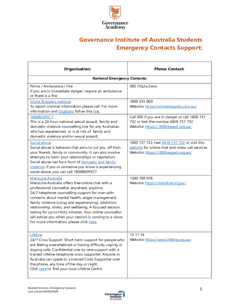 This document provides a comprehensive list of emergency contacts and support services available to students of the Governance Institute of Australia. It includes national emergency numbers, mental health support services, domestic violence resources, and financial counselling options. The document is intended to assist students in accessing immediate help in times of crisis.