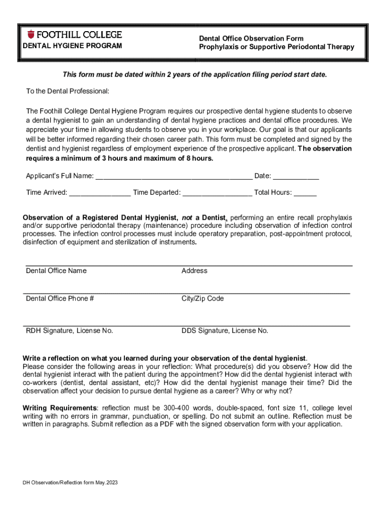 This form is used by prospective dental hygiene students to document their observation of a dental hygienist performing procedures and to reflect on their experience as part of the application process for the Foothill College Dental Hygiene Program.