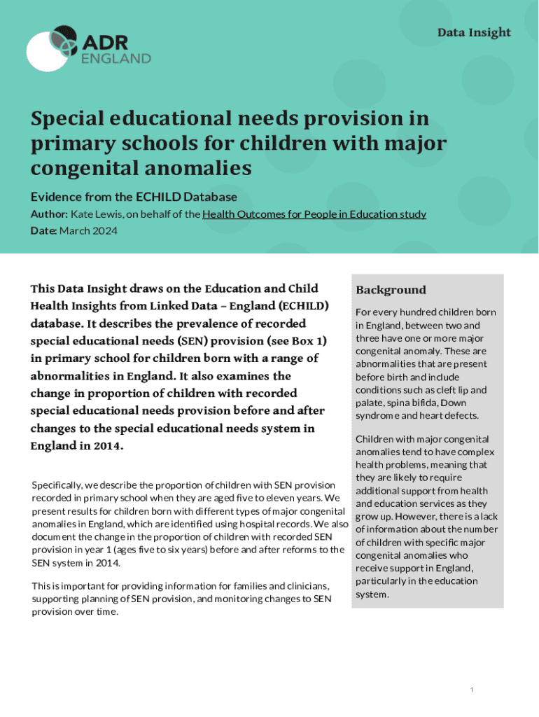 Special educational needs provision in primary schools for children with major congenital anomalies Evidence from the ECHILD Database Author: Kate Lewis, on behalf of the Health Outcomes for People in Education study Date: March 2024This Data Insight draws on the Education and Child Health Insights from Linked Data England (ECHILD) database. It describes the prevalence of recorded special educational needs (SEN) provision (see Box 1) in primary school for children born with a range of...