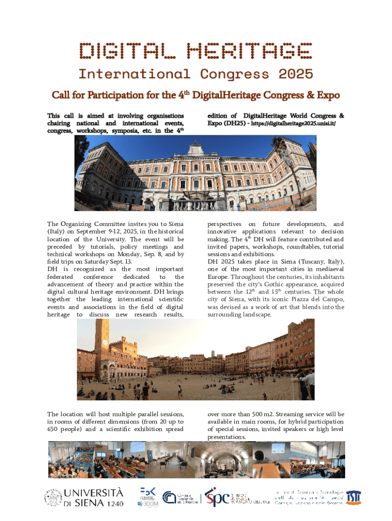 This document serves as a call for participation in the 4th Digital Heritage World Congress & Expo (DH25) to be held in Siena, Italy, from September 9-12, 2025. It invites organizations to propose events, workshops, or exhibitions relevant to digital cultural heritage and outlines the necessary participation details.