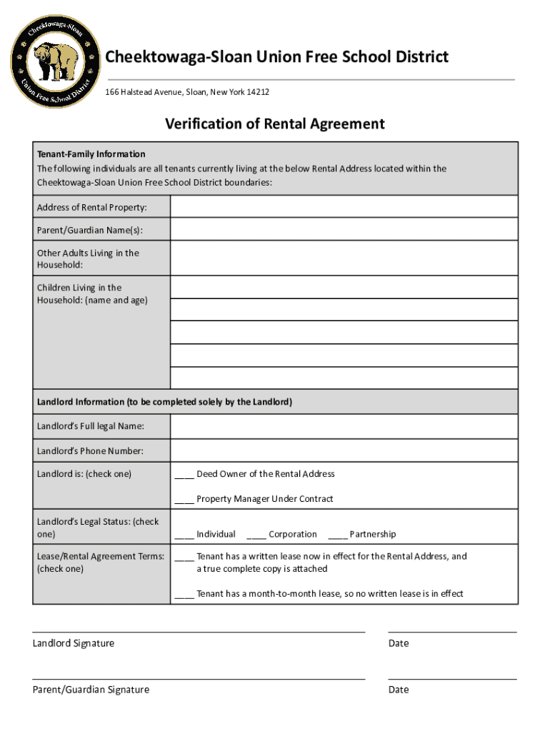 Form used to verify rental agreements and tenant information within the Cheektowaga-Sloan Union Free School District.