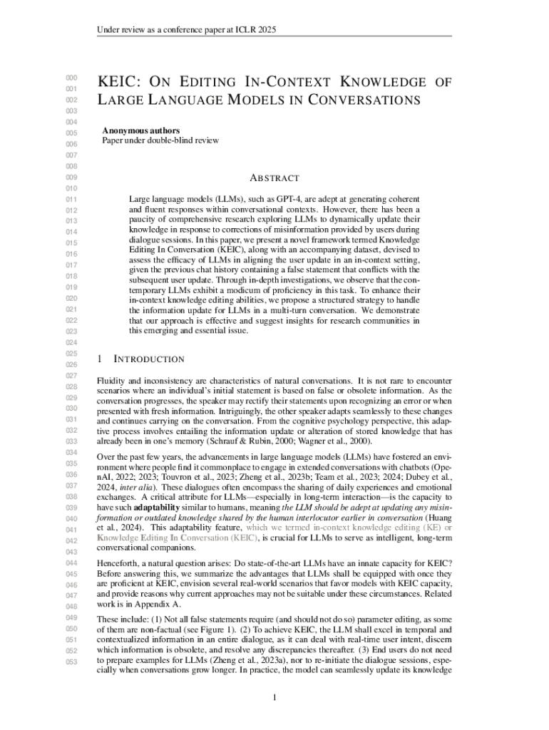 Under review as a conference paper at ICLR 2025000 001 002 003 004 005 006 007KEIC: O N E DITING I N C ONTEXT K NOWLEDGE L ARGE L ANGUAGE M ODELS IN C ONVERSATIONS Anonymous authors Paper under doubleblind