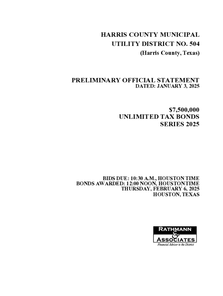 HARRIS COUNTY MUNICIPAL UTILITY DISTRICT NO. 504 (Harris County, Texas)PRELIMINARY OFFICIAL STATEMENT DATED: JANUARY 3, 2025$7,500,000 UNLIMITED TAX BONDS SERIES 2025BIDS DUE: 10:30 A.M., HOUSTON TIME BONDS AWARDED: 12:00 NOON, HOUSTON TIME THURSDAY, FEBRUARY 6, 2025 HOUSTON, TEXASRATHMANNASSOCIATES Financial Advisor to the DistrictThis Preliminary Official Statement and the information contained herein are subject to completion or amendment. These securities may not be sold nor may