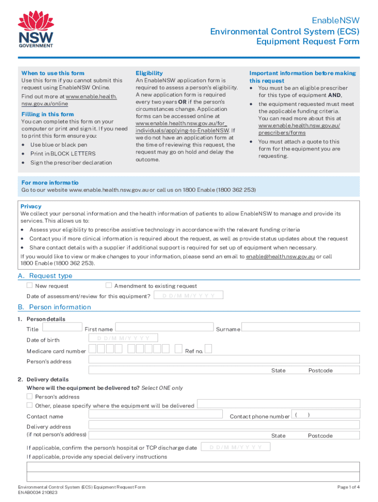 Este formulario se utiliza para solicitar equipo del Sistema de Control Ambiental para aquellos que no pueden enviar su solicitud a través de EnableNSW Online. Se requiere una evaluación de elegibilidad y la presentación de una cotización para el equipo solicitado.