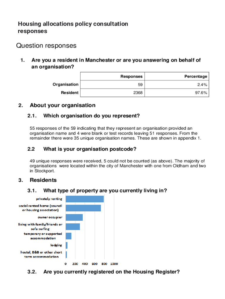Housing allocations policy consultation responsesQuestion responses 1.2.Are you a resident in Manchester or are you answering on behalf of an organisation? ResponsesPercentageOrganisation592.4%Resident236897.6%About