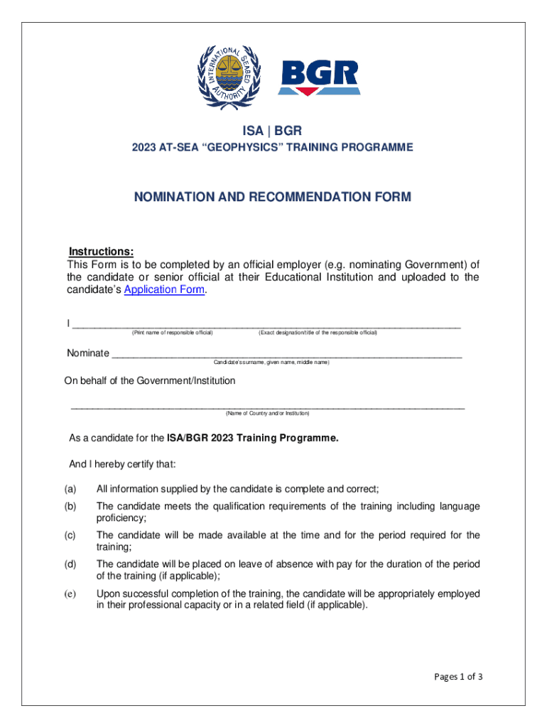 This form is to be completed by an official employer or a senior official at the candidate\'s educational institution, nominating the candidate for the ISA/BGR 2023 Training Programme and certifying their qualifications and readiness for the training.