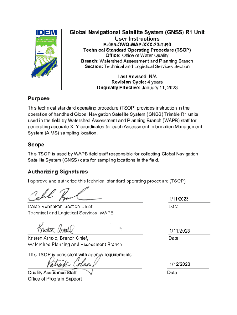 This technical standard operating procedure (TSOP) provides instruction in the operation of handheld Global Navigation Satellite System (GNSS) Trimble R1 units used by Watershed Assessment and Planning Branch staff for generating accurate X, Y coordinates for sampling locations.