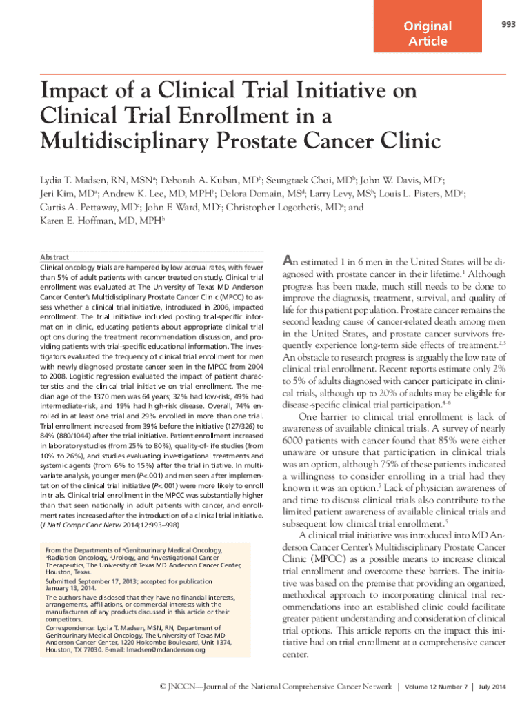 Original Article993Impact of a Clinical Trial Initiative on Clinical Trial Enrollment in a Multidisciplinary Prostate Cancer Clinic Lydia T. Madsen, RN, MSNa; Deborah A. Kuban, MDb; Seungtaek Choi,