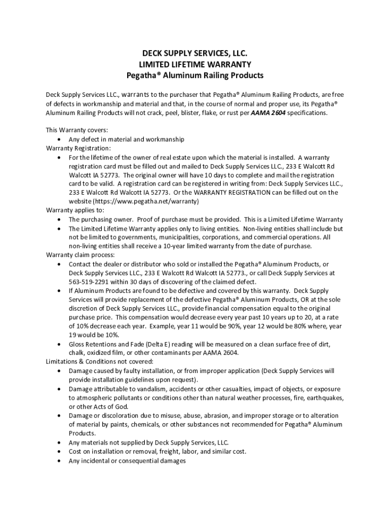 This document outlines the Limited Lifetime Warranty provided by Deck Supply Services, LLC for Pegatha® Aluminum Railing Products, detailing the warranty coverage, registration process, claim procedures, limitations, and specific conditions.