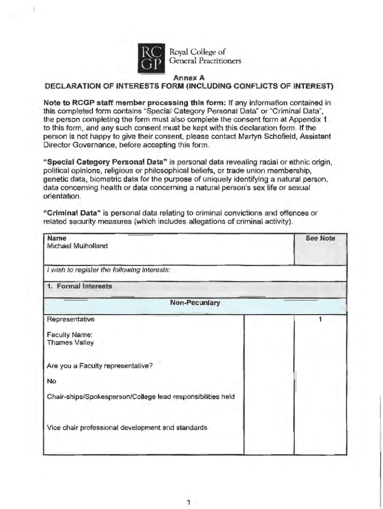 Este formulario permite a los miembros del RCGP registrar sus intereses formales e informales, incluyendo posibles conflictos de interés relacionados con la atención médica y otras actividades.