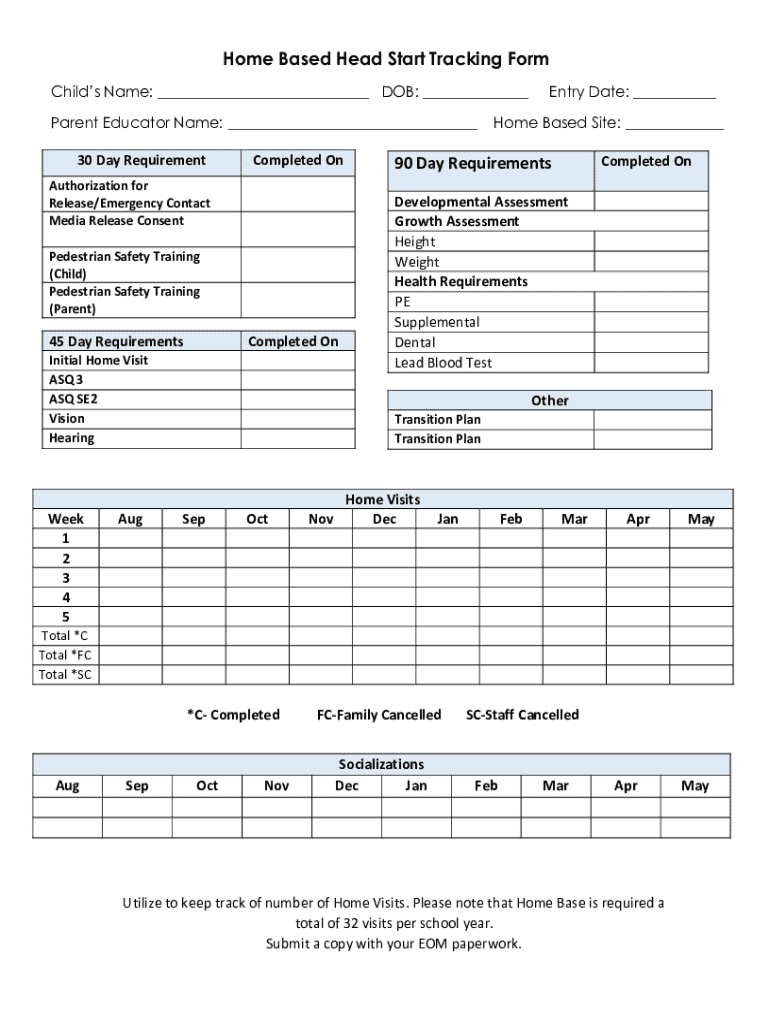 This form is designed to track the progress and requirements of children enrolled in a Home Based Head Start program, including assessments and home visits.