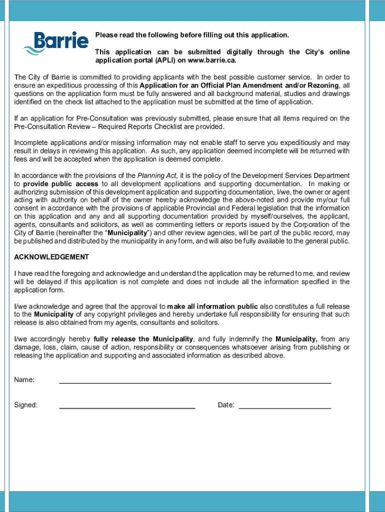This application form is intended for individuals wishing to apply to the City of Barrie for an Official Plan amendment and/or a Zoning By-law amendment. The document outlines the necessary procedures, required documentation, fees, and important notes regarding the application process.