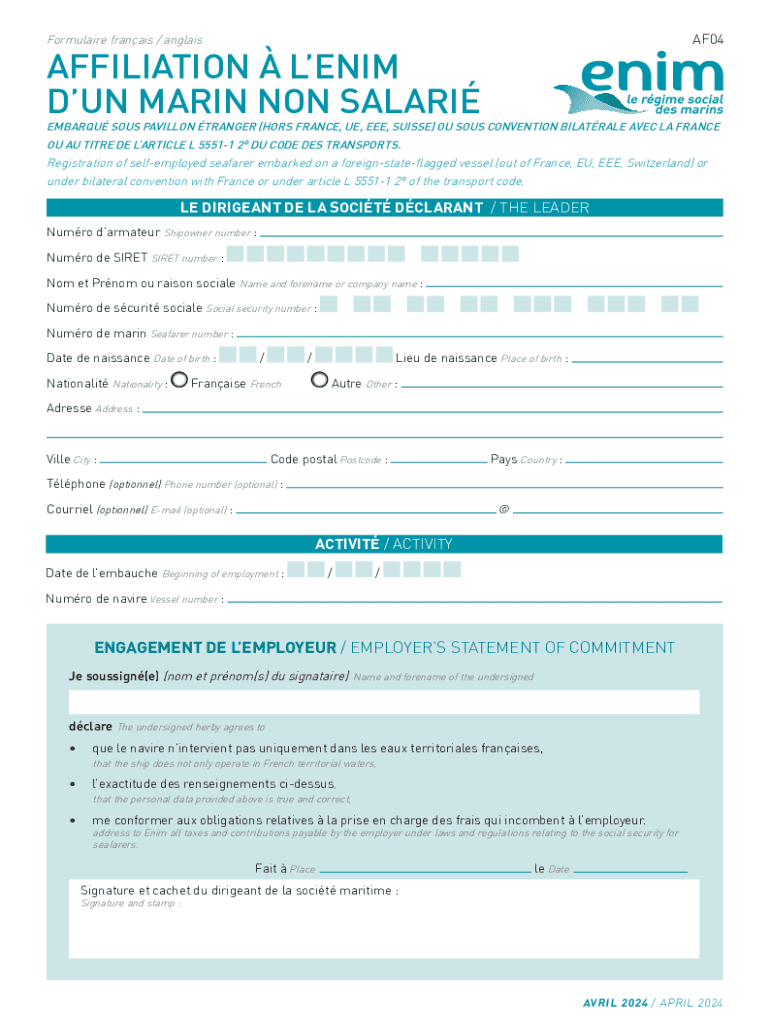 Formulaire pour l\'affiliation à l\'ENIM d\'un marin non salarié embarqué sous pavillon étranger ou selon des conventions bilatérales avec la France.