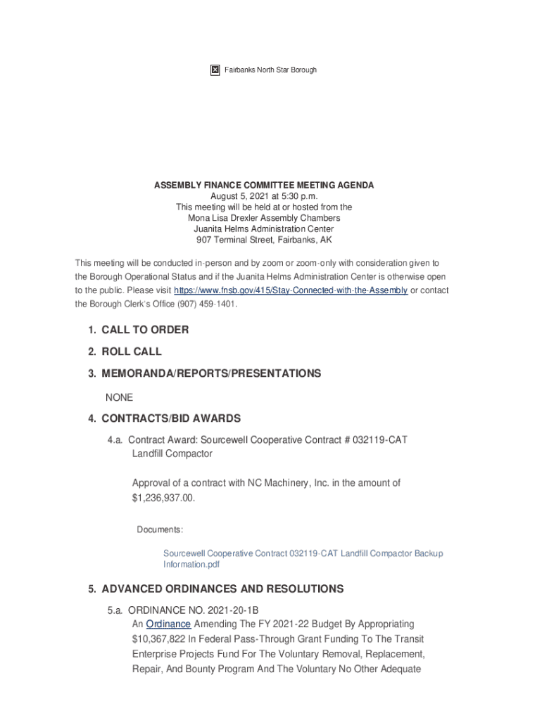 This document outlines the agenda for the Fairbanks North Star Borough Assembly Finance Committee meeting held on August 5, 2021. It includes call to order, roll call, and various agenda items, including