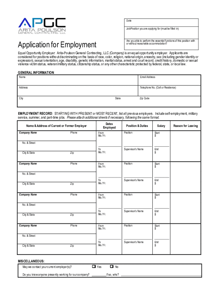 This application form is used by Arita-Poulson General Contracting, LLC to collect information from applicants for employment, including personal information, employment history, education, and references. It emphasizes equal opportunity employment and includes policies regarding identity verification, medical examinations, and the at-will nature of employment.