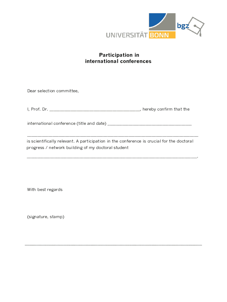 Participation in international conferencesDear selection committee,I, Prof. Dr. ___, hereby confirm that the international conference (title and date) ___ ___ is scientifically relevant. A participation