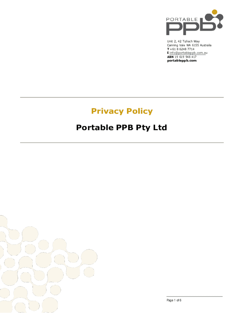Unit 2, 42 Tulloch Way Canning Vale WA 6155 Australia T +61 8 6248 7714 E info@portableppb.com.au ABN 19 619 948 417 portableppb.comPrivacy Policy Portable PPB Pty LtdPage 1 of 61.ScopeThis Privacy Policy sets out our commitment to protecting the privacy of personal information provided to us, or otherwise collected by us, offline or online, including through our website and mobile application (Site). In this Privacy Policy we, us or our means Portable PPB Pty Ltd ABN:19 619 948 417. 2
